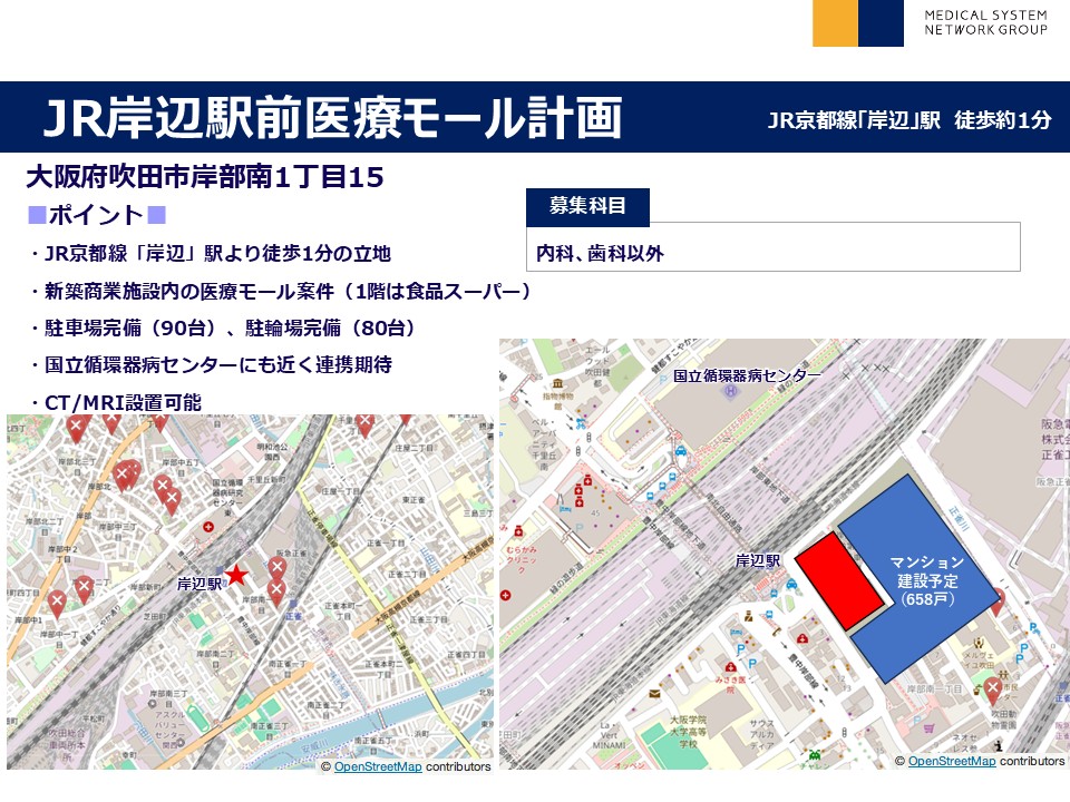 | メリット | 幹線道路沿い・住宅街近接・競合医療機関少ない・築浅(5年以内)・医療専用ビル | ||||||||||